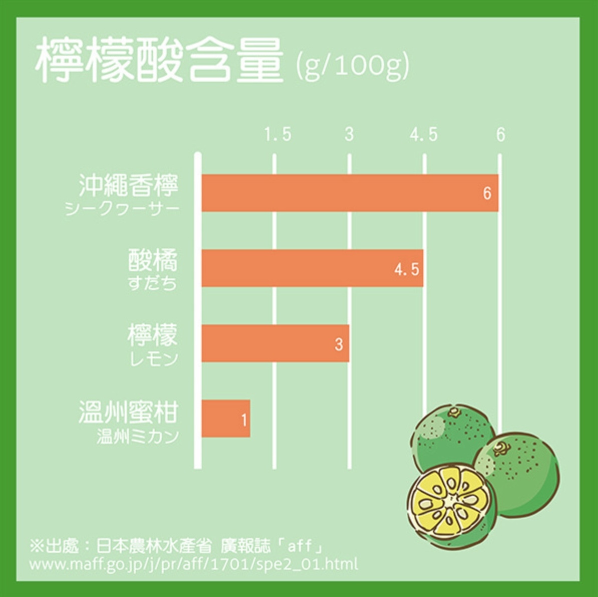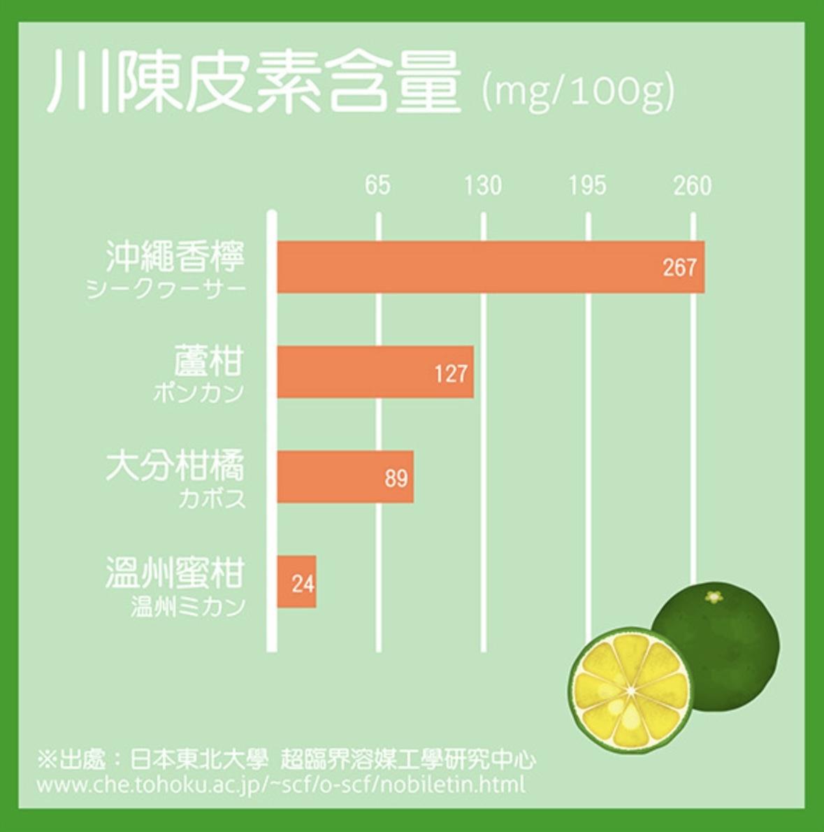 沖繩香檸的川陳皮素含量是柑橘類中數一數二的;而檸檬酸的含量更是檸檬的兩倍。