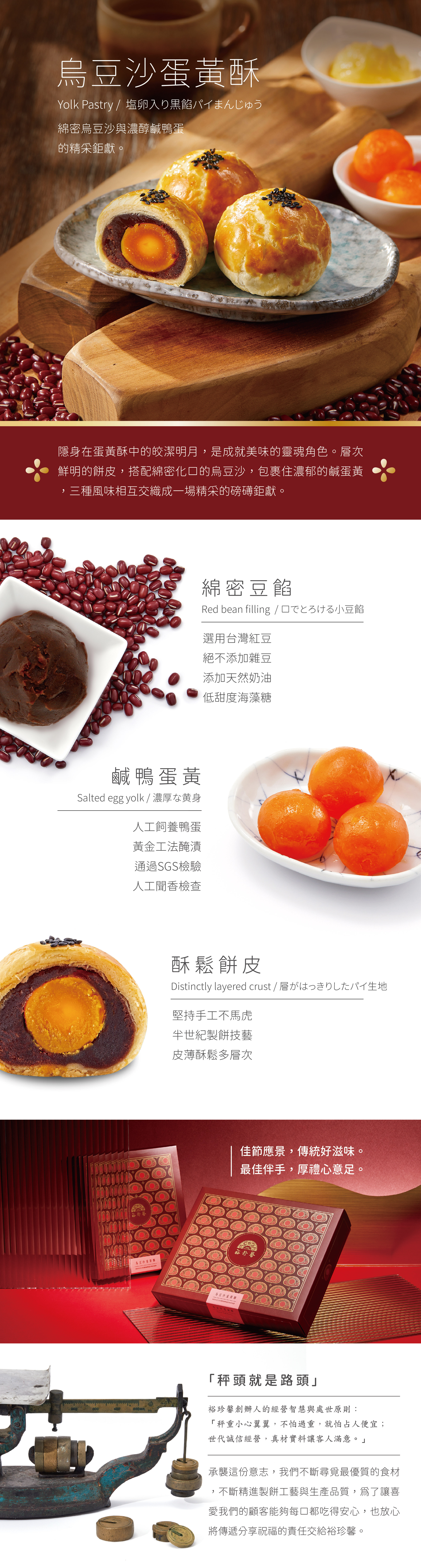 綿密細緻的烏豆沙餡,包裹住一整顆濃醇的鴨蛋蛋黃,搭配低甜度海藻糖,口感滋潤溫順;輕咬一口,層次鮮明的餅皮、化口的紅豆餡、濃郁的蛋黃,一起在口中舞出甜鹹交融圓舞曲,幸福滿點